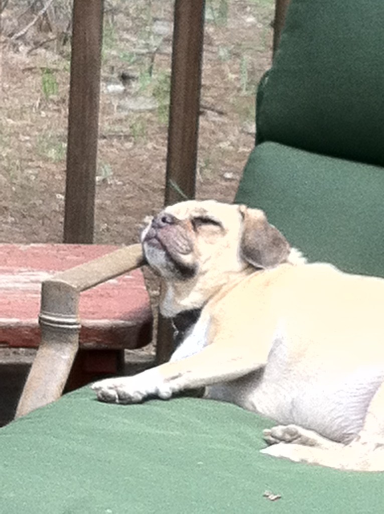 She LOVED to eat, but as a puggle she had a rather oddly shaped bod: barrel body, broad shoulders, and spindly legs. Having her stand on you while riding in the car was extraordinarily painful as all that weight concentrated into little paws. Ergo, jumping/climbing was difficult, but if there was food at the end of it, by god, she’d levitate if she had to.