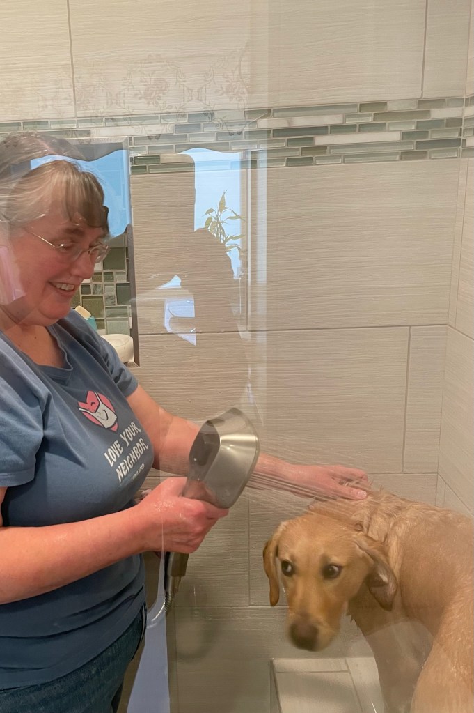 Back at home, she went in the bath… or more accurately, the shower. When we had the master bath, which is quite small, remodeled, we added a seat large enough for a medium sized dog to stand and get washed.