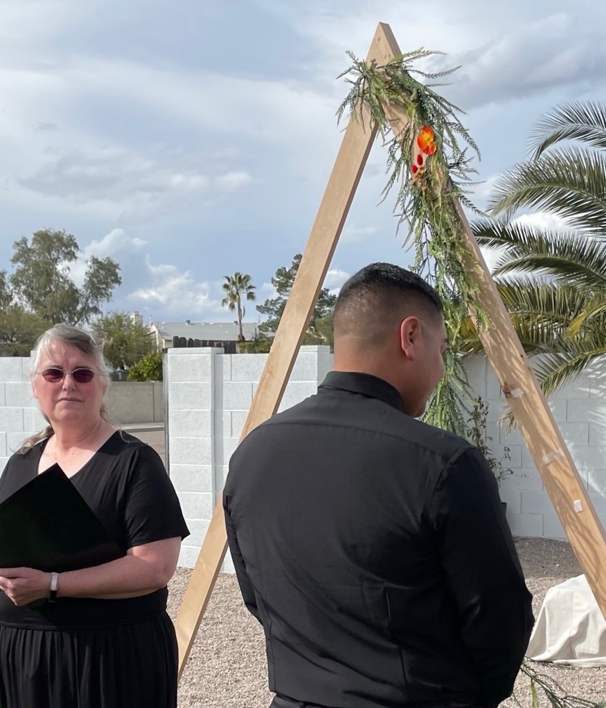 It was beautiful and joyous and several people cried. It was an incredible honor to tell a man facing away to “turn now” as the bride started down the aisle so he caught the first glimpse of his beloved in her dress.