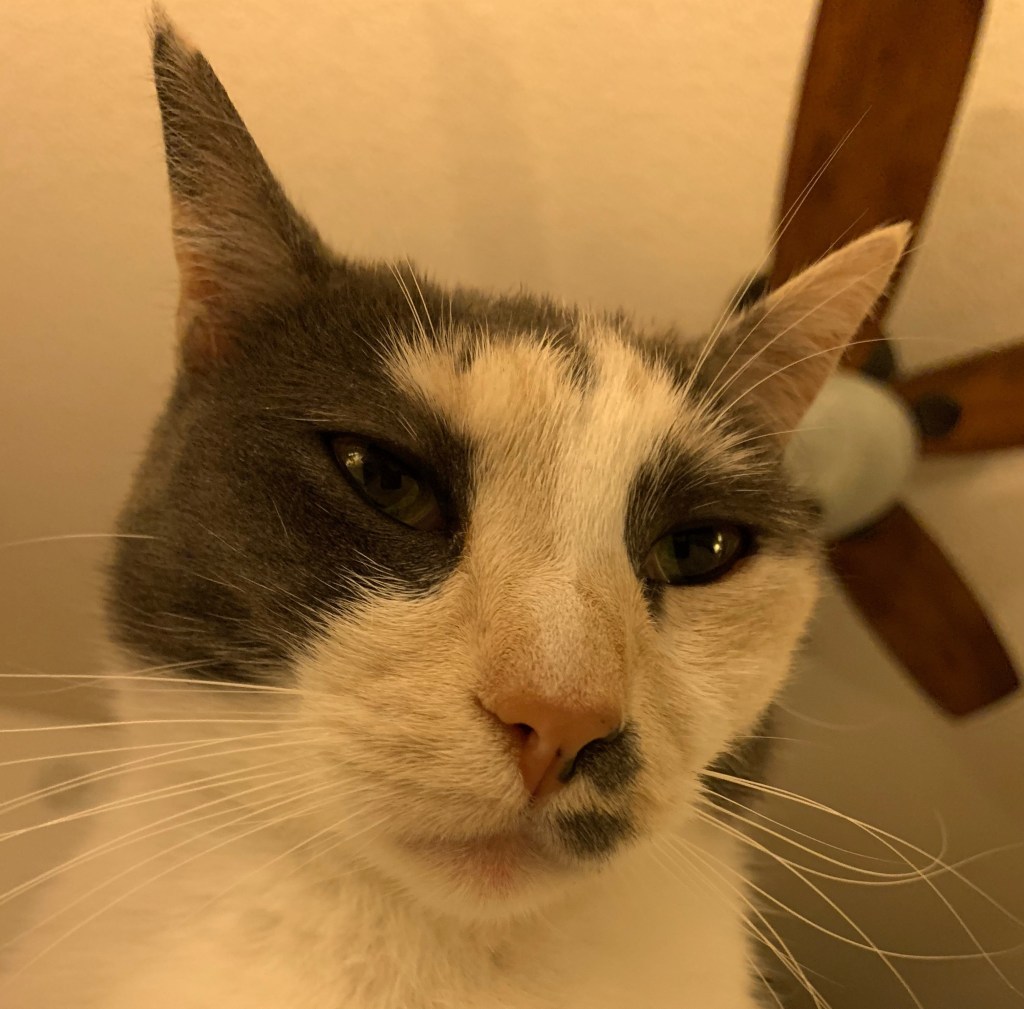 She’s a stinker. My read on it is, there are countless wonderful cats in need of caring homes, and we get MaeMae? C’mon, can’t we trade her in for a loving, happy snuggle-muffins?