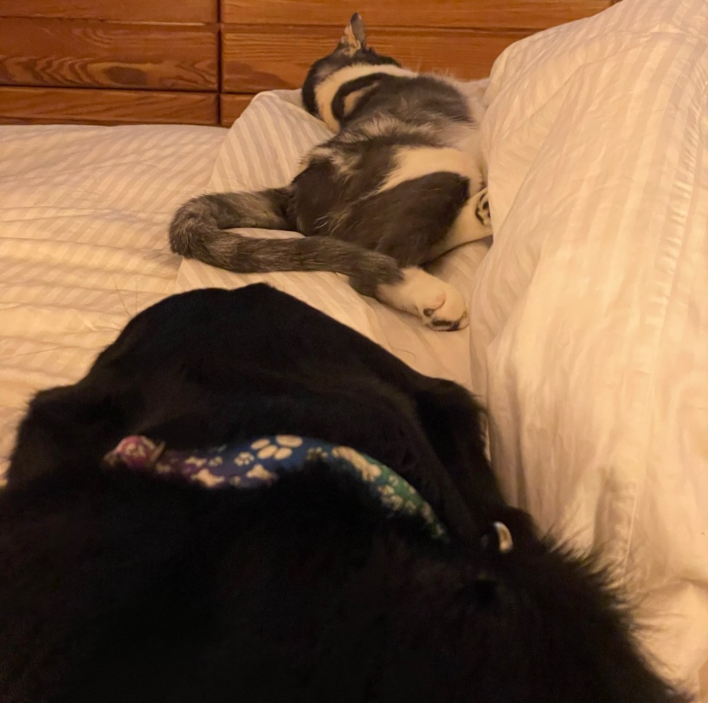 At this point it’s a matter of hauling him into position – the only way we’re all gonna get even a modicum of rest is the three of us laying like soldiers perpendicular to the pillow, dog in the middle, cat at the foot.