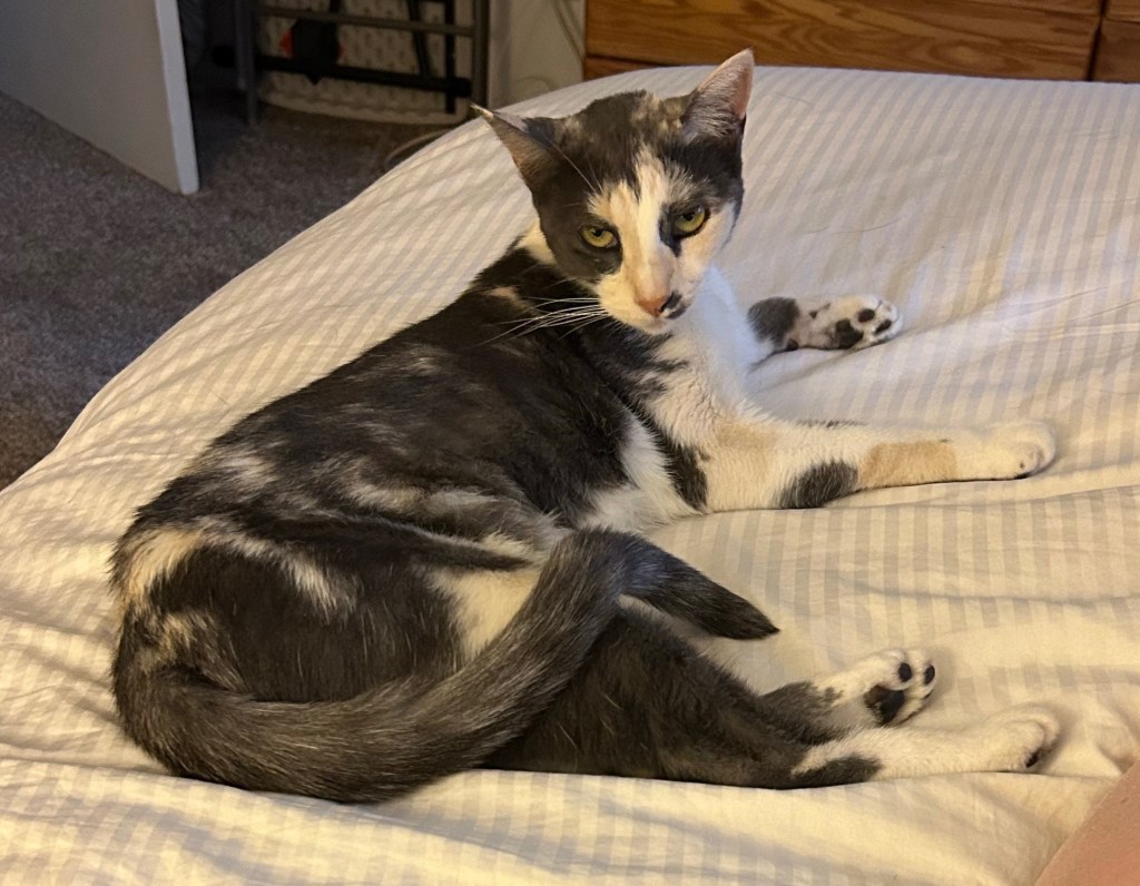 He has to be in the middle of the bed because he stretches out his paws. If you fold them into his body then rapidly lay down, it’s possible to get the three of us on there.