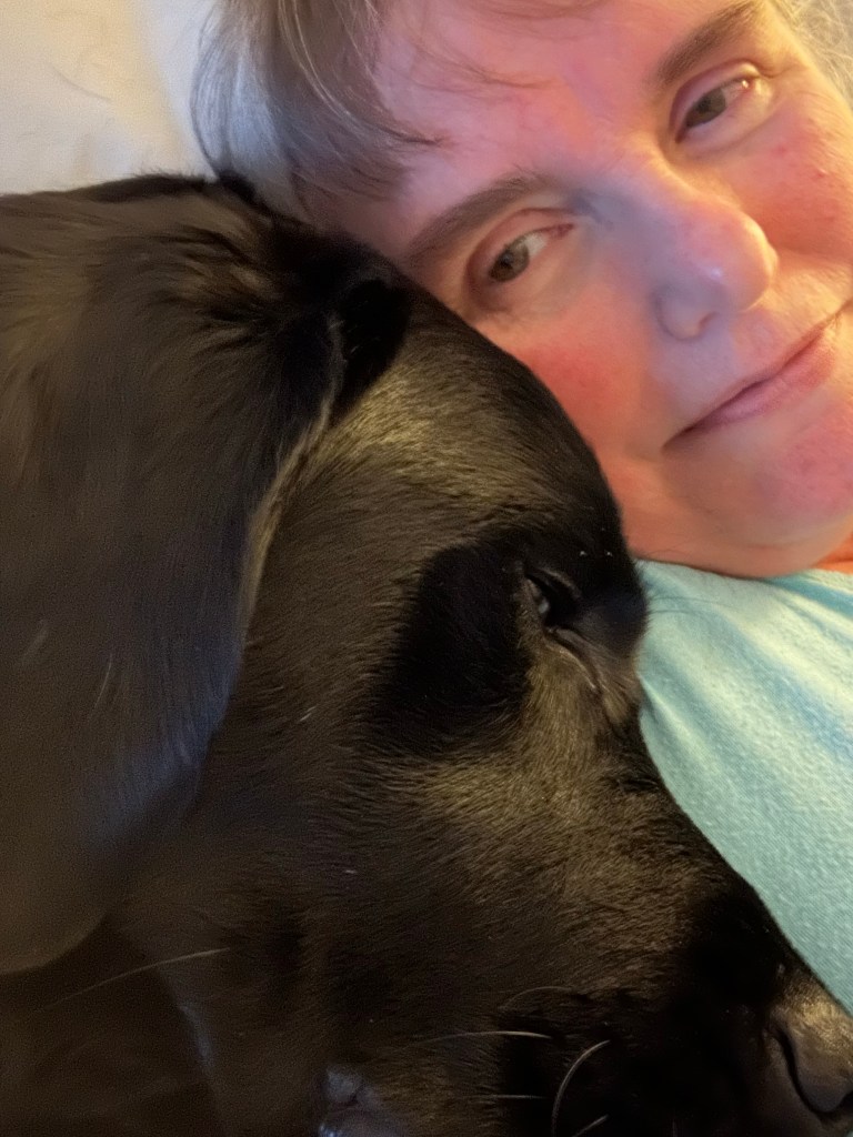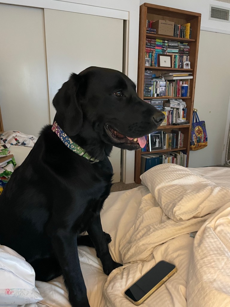 So I gotta say, that bed is way, waaaaaaay too small for a fully grown male lab, a cat with anger issues, Beloved and me. Treble is a total gentleman – he recognizes the cat’s eminent domain and waits to be invited on the bed. Even then, he won’t get up unless the cat is at the foot, I’m sitting in the middle between them, and he can gracefully leap onto my pillow.