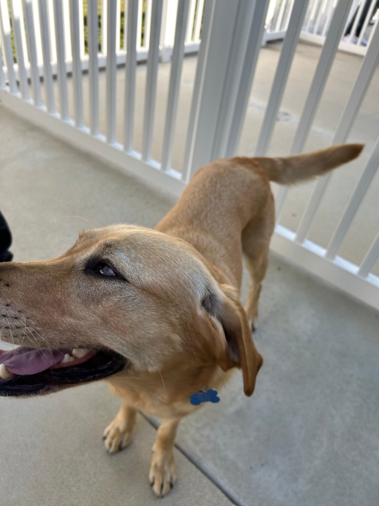 Beloved got to her first – fitting as she was the primary raiser – and while she didn’t go insane, her tail could’ve levitated her hind quarters, it was wagging so hard. she was clearly thrilled to see us all.