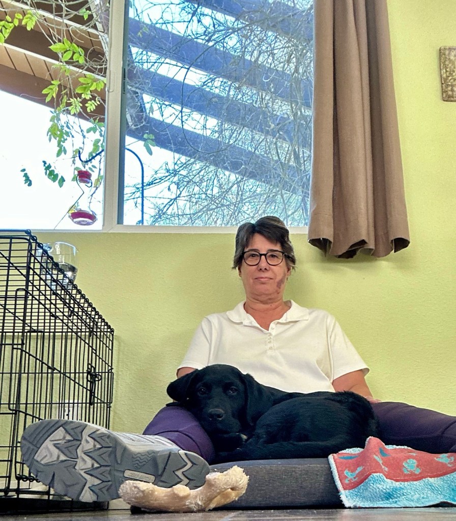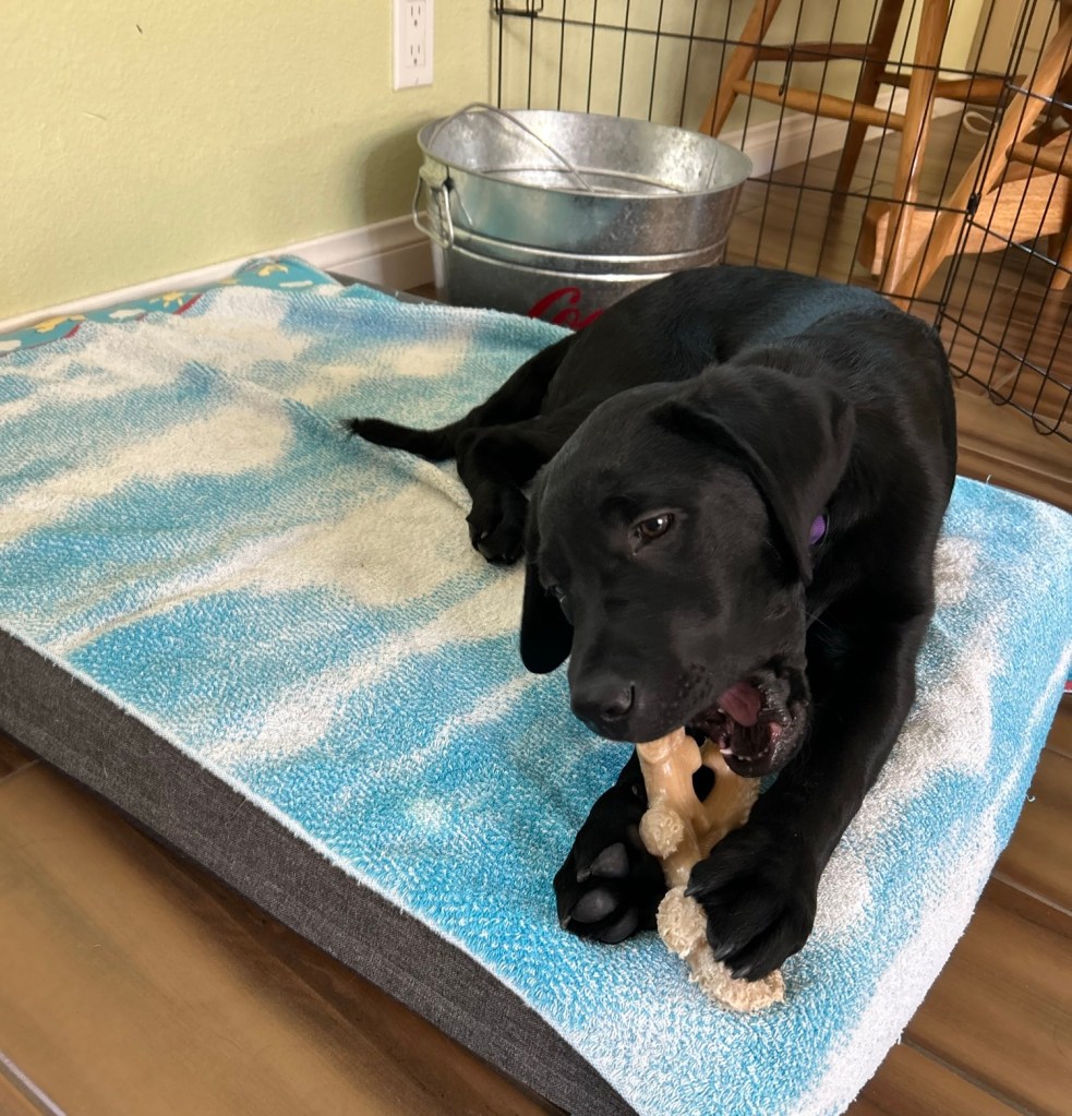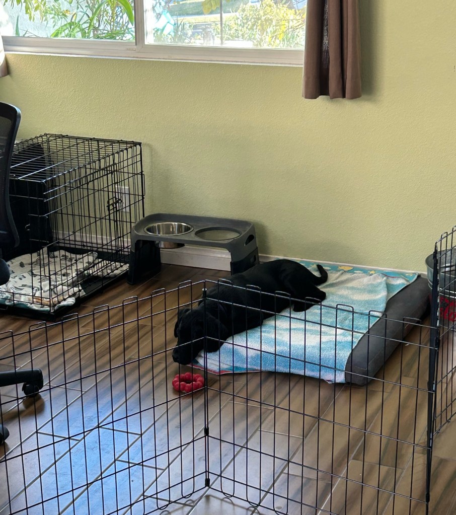 Okay, it’s not a cage, it’s an X-Pen. And we spent a lot of time in there with him… he stayed with us for a few days and it was just easier to have the twelve-week-old corralled in a fairly enclosed area.