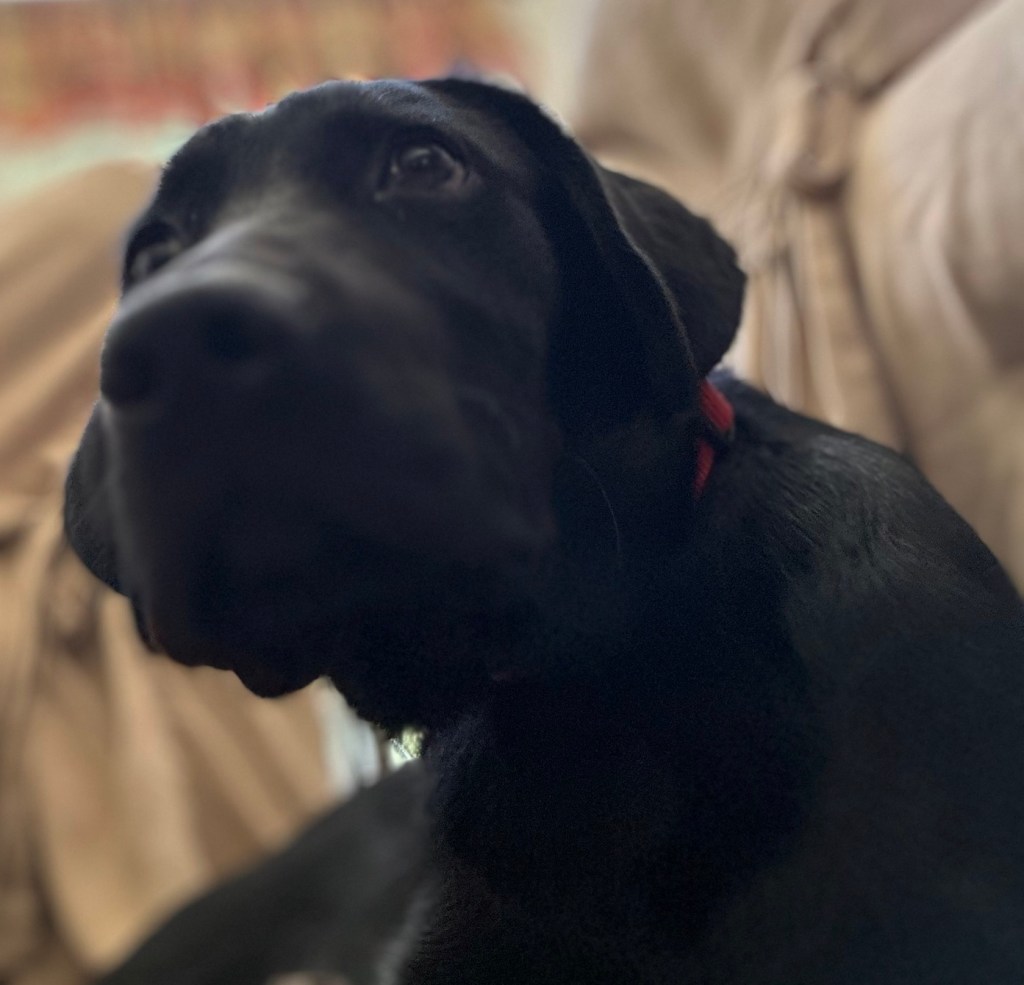 He’s a black lab, beautiful, almost six months old, so laid back he’s horizontal (most of the time) with a limp on his front right paw, not sure why. It really looks like his leg is longer than the other three and it’s sending him off kilter.