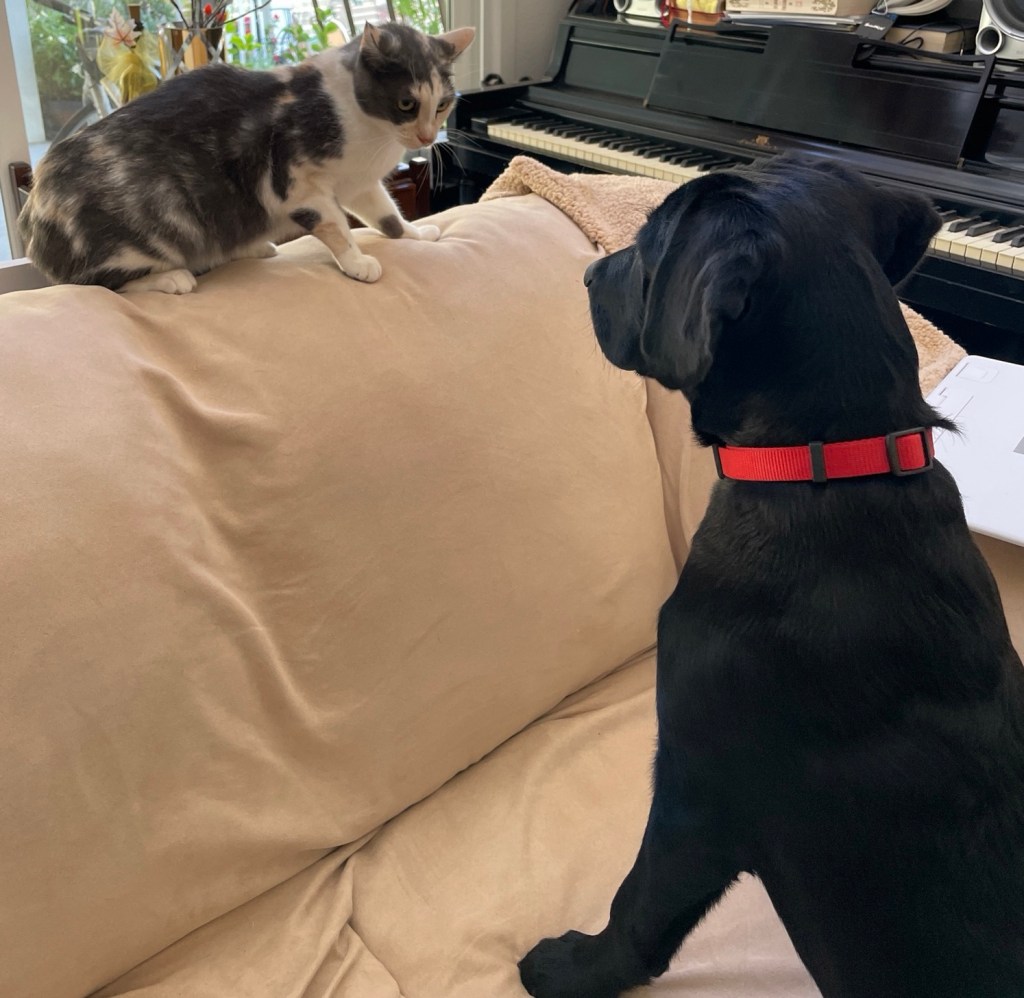 As a result, he was on leash whenever we went to get busy. He’d pretend to be calm then lunge at the cat, choking himself in the process. MaeMae trusts (mostly) I’m gonna keep the pup in check, and sits and glowers at him, but she sure wasn’t coming upstairs. She likes to sleep on our bed, and it was pissing her off that she couldn’t.